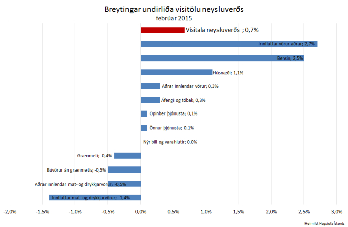 Vísitala neysluverðs hækkaði um 0,67% í febrúar og er ársverðbólga óbreytt frá fyrra mánuði 0,8% að því er fram kemur í nýjum tölum sem Hagstofa Íslands birti í morgun. Húsnæðisverð er enn leiðandi í hækkun verðlags en vísitala neysluverðs hefur lækkað um 0,9% undanfarið ár sé húsnæðisliðurinn undanskilinn. Breytingar á verðlagi í mánuðinum má að […]
