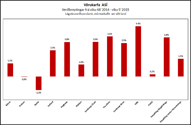 Vörukarfa ASÍ hefur hækkað hjá 11 verslunum frá því í desember 2014 (viku 48) þar til í lok febrúar (vika 9). Mesta hækkunin á þessu tímabili er hjá Víði, Kaupfélagi Skagfirðinga og 10/11. Á sama tímabili lækkar vörukarfan hjá Nettó. Í heildina er það mat verðlagseftirlitsins að breytingar á virðisaukaskatti og vörugjöldum gefi tilefni til […]